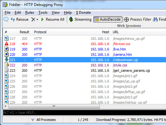 - Watch the traffic in fiddler - it'll show you every request going in and out. When you see something that looks like a video feed (in this case it's /videostream.cgi) click on File and untick "Capture Traffic".