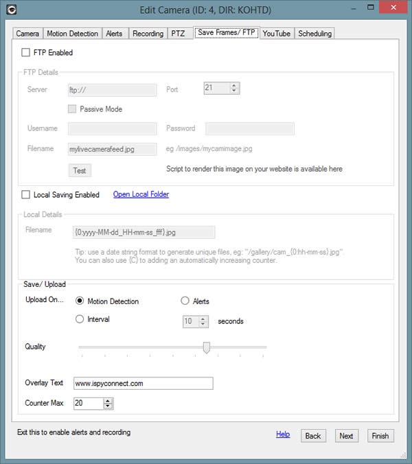 iSpy can FTP frames to any FTP server (or SFTP server) on Motion Detection, Alert or on an Interval. Check the top box to Enable FTP. iSpy can also save files locally using the same naming options as with FTP. Images saved locally are available on the website under the file manager in the grabs folder for the specific camera.
