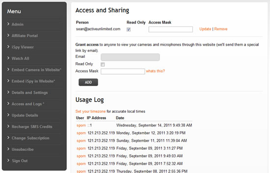 iSpyConnect keeps a log of every user and IP address that logs into iSpy and accesses your account. You can keep track of this information on this page under "Usage Log". Clicking on the username brings up an email link for that person.