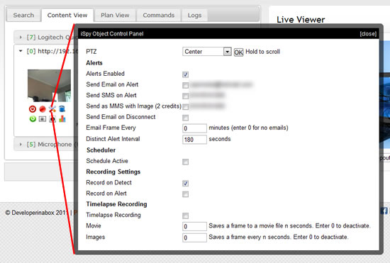 Important: These controls are live controls - there is no save button on the panel, as soon as you check a checkbox or modify an entry that setting is updated in iSpy.