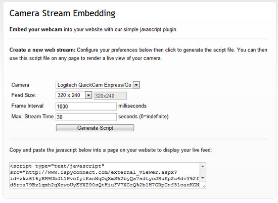 iSpyConnect can generate a script file that enables you to embed a feed from your cameras in your own website. You can generate as many feeds as you like and even combine them on the same page. To access this click the "Embed" button below the "Live Viewer" or click "Embed Camera in Website" link on the menu on your account page. You can specify the feed size, frame interval (time to pause between successive frame requests to save bandwidth) and the maximum stream time. iSpyConnect encrypts this configuration to prevent people from modifying the settings.