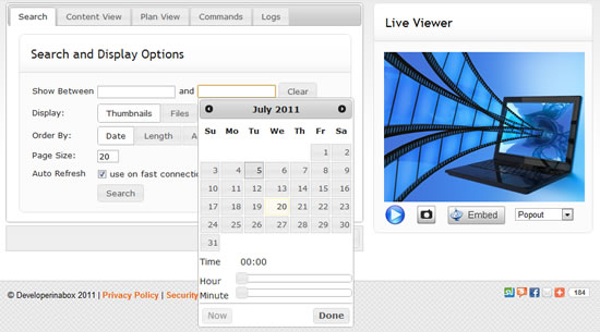 This tab contains all the stored content and controls for all connected cameras and microphones. Click the left-most thumbnail (a live grab from your camera) to watch live video in the "Live Viewer" on the right. The scrollable area to the right of the thumbnail contains all the content that this camera has recorded.