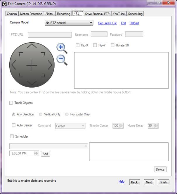 - Select your camera model in the PTZ dropdown and check the Scheduler checkbox.