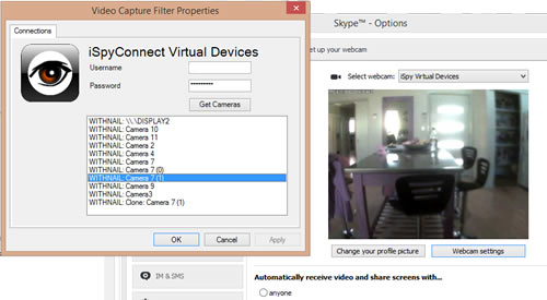 When you then connect a third party application to the virtual device driver ispy will return a multi cam feed of your selected devices. You can change your camera selections in ispy and the feed into skype will be updated live without having to go back into properties which makes it easy to swap in and out video feeds.
