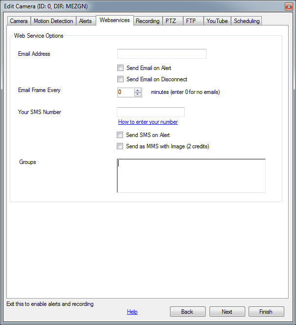 Enter your mobile phone number here to receive an SMS alert. The number must start with your country code, followed by your number excluding the leading zero. For example if you live in Australia and your mobile number is 0416 123456 then you'd enter 61416123456. If you are away from home and you are getting too many SMS alerts you can turn them off for specific cameras through iSpyConnect.